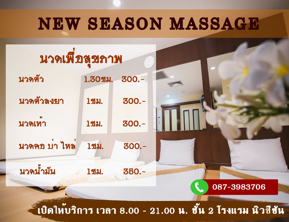 08.00 am to 9.00 pm.New Season Massage offers Thai massage, Oil massage and foot massage. With the experience of our staff it makes your feel relaxed.